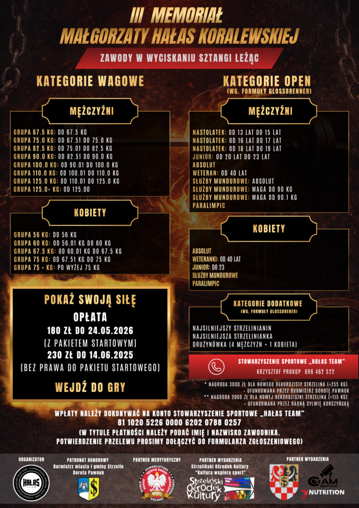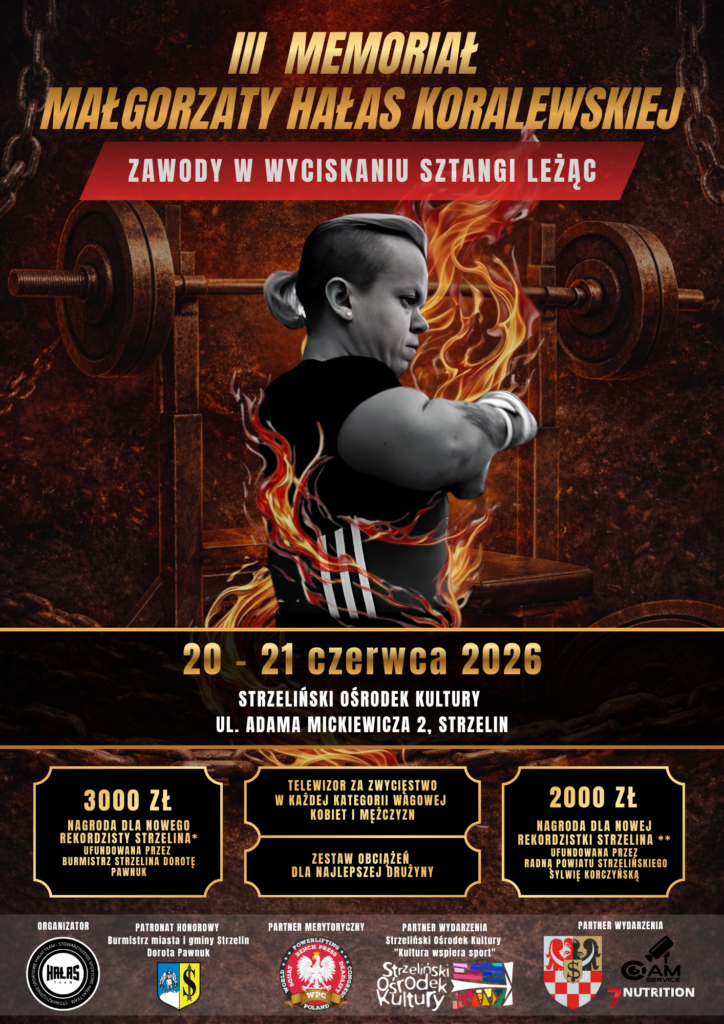 Stowarzyszenie Sportowe”HAŁAS TEAM” zaprasza na:”III Memoriał Małgorzaty Hałas – Koralewskiej” Zawody w wyciskaniu sztangi leżąc, które odbędą się w Strzelińskim Ośrodku Kultury ul. Adama Mickiewicza 2, Strzelin 20-21 czerwca 2026 r.